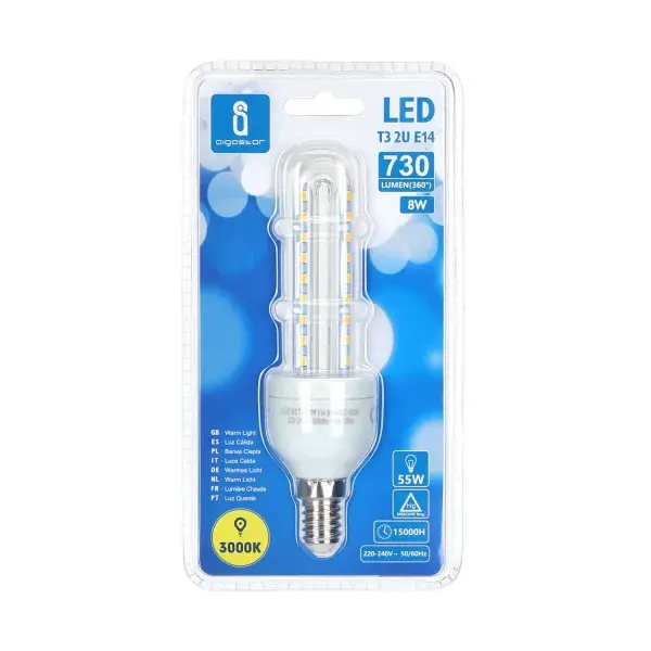 Lampadina LED 8W E14 a forma di U, ideale per risparmiare energia e fornire un'illuminazione efficiente in case e uffici.