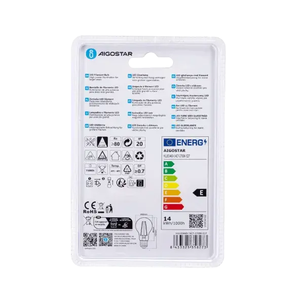 Lampadina LED A60 E27 14W con filamento trasparente, ideale per illuminazione decorativa ed efficiente in case e spazi.