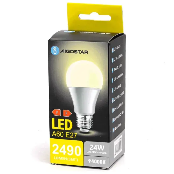 Lampadina LED A60 E27 24W 4000K, luce neutra; ideale per l'illuminazione generale in case e uffici.