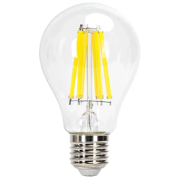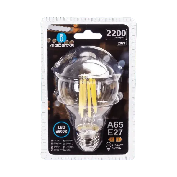 bombilla led a65 e27 20w de filamento transparente, ideal para iluminacin clida y decorativa en hogares y negocios.