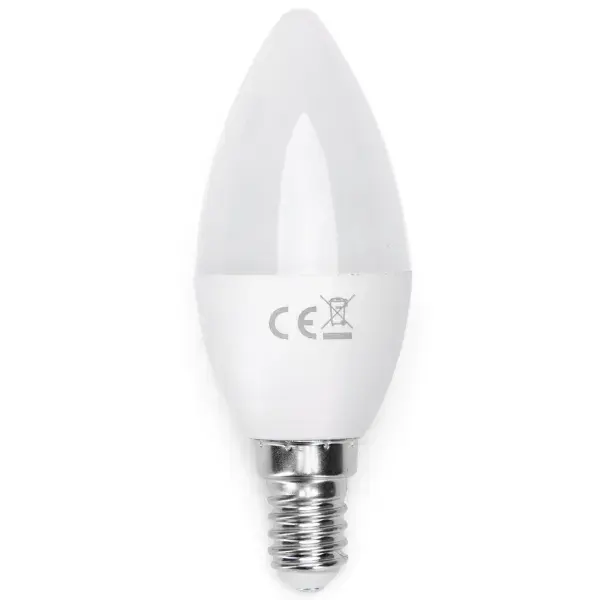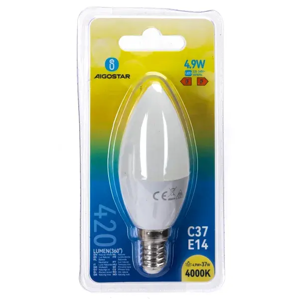 Lampadina LED C37 E14 4.9W, luce calda, risparmio energetico, ideale per illuminazione decorativa e risparmio sulla fattura elettrica.