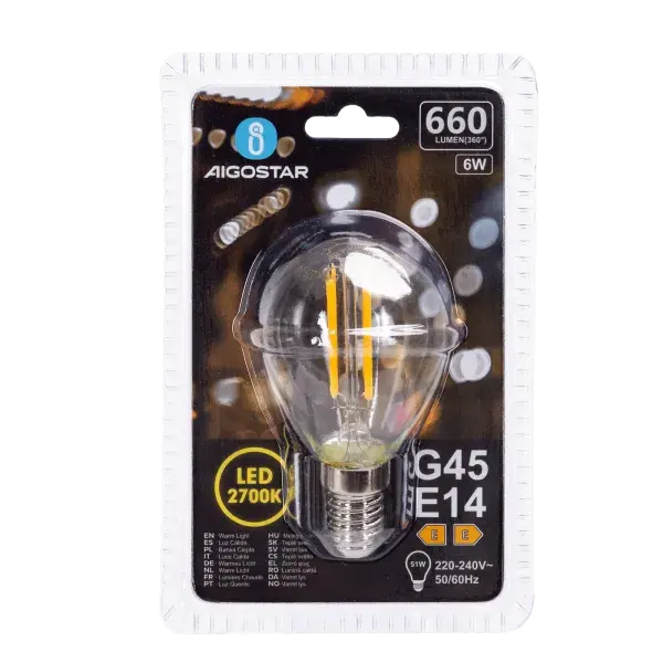 Lampadina LED a filamento G45 E14 6W, trasparente, efficiente, ideale per illuminazione decorativa e d'ambiente.