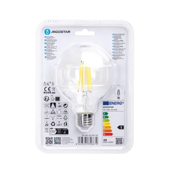 Lampadina LED a filamento G95 E27 20W, luce calda, a risparmio energetico, ideale per decorazione e ambienti accoglienti.