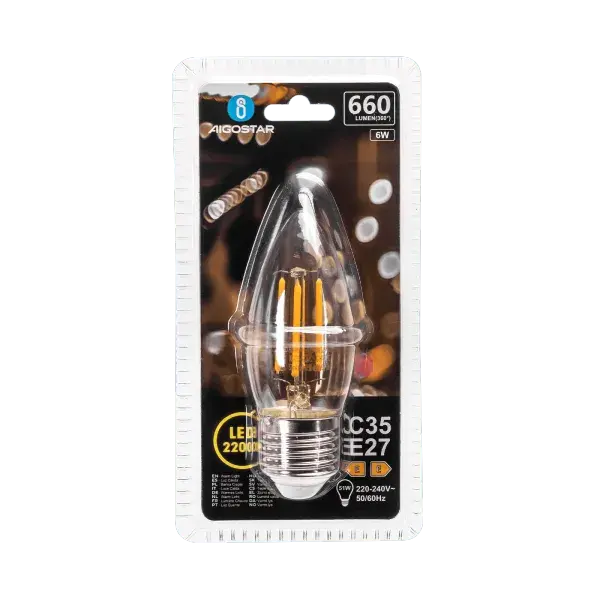 bombilla led de filamento mbar c35 e27 6w, luz clida y eficiente, ideal para iluminacin decorativa y atmsferas acogedoras.