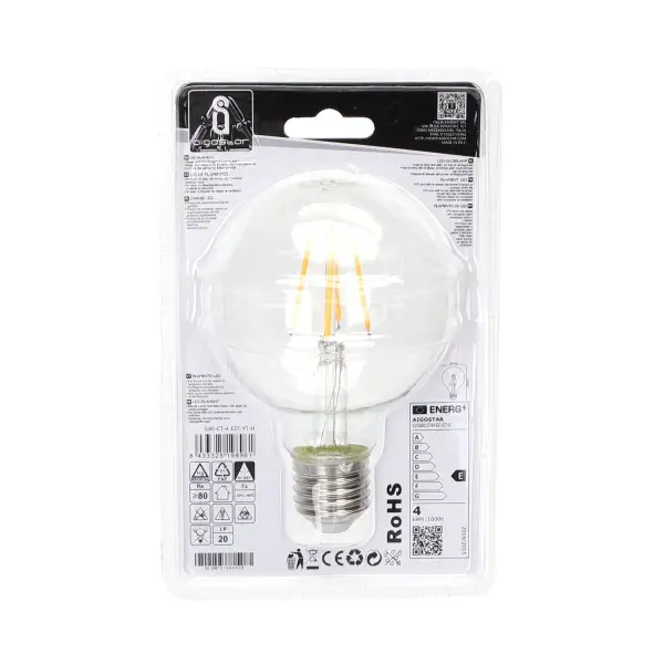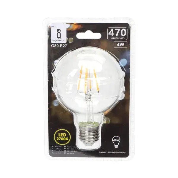 bombilla led filamento g80 e27 4w transparente, ahorro energtico, luz clida, ideal para decoracin y ambientes acogedores.