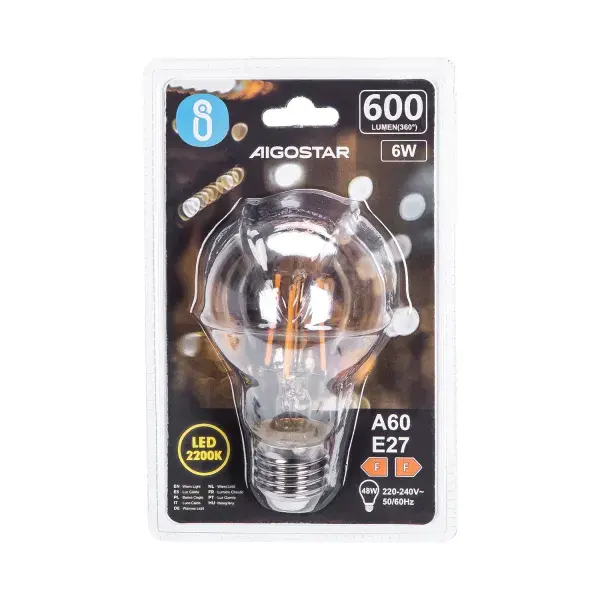 Lampadina LED a filamento A60 E27 6W, luce calda, ad alta efficienza energetica, ideale per decorazione e ambienti accoglienti.