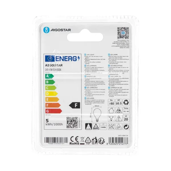 bombilla led g45 e14 4.9w, 400 lmenes, 2700k, eficiencia energtica, ideal para iluminacin ambiental y decoracin en