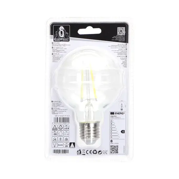 Lampadina LED G80 E27 8W a filamento trasparente, ideale per illuminazione decorativa e d'ambiente in case e negozi.