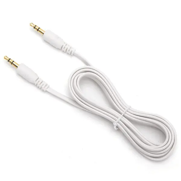 cable de audio de 1,5 m en color blanco, ideal para conectar dispositivos de sonido en casa o estudios.