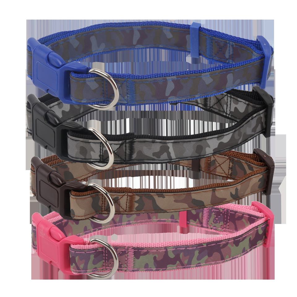 Collare riflettente mimetico per cani: resistente, regolabile e leggero; ideale per passeggiate notturne e sicurezza all'aperto.
