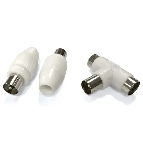 Connettore per antenna TV femmina-femmina, pin bianchi, compatibile con varie antenne per migliorare segnale e connettività.