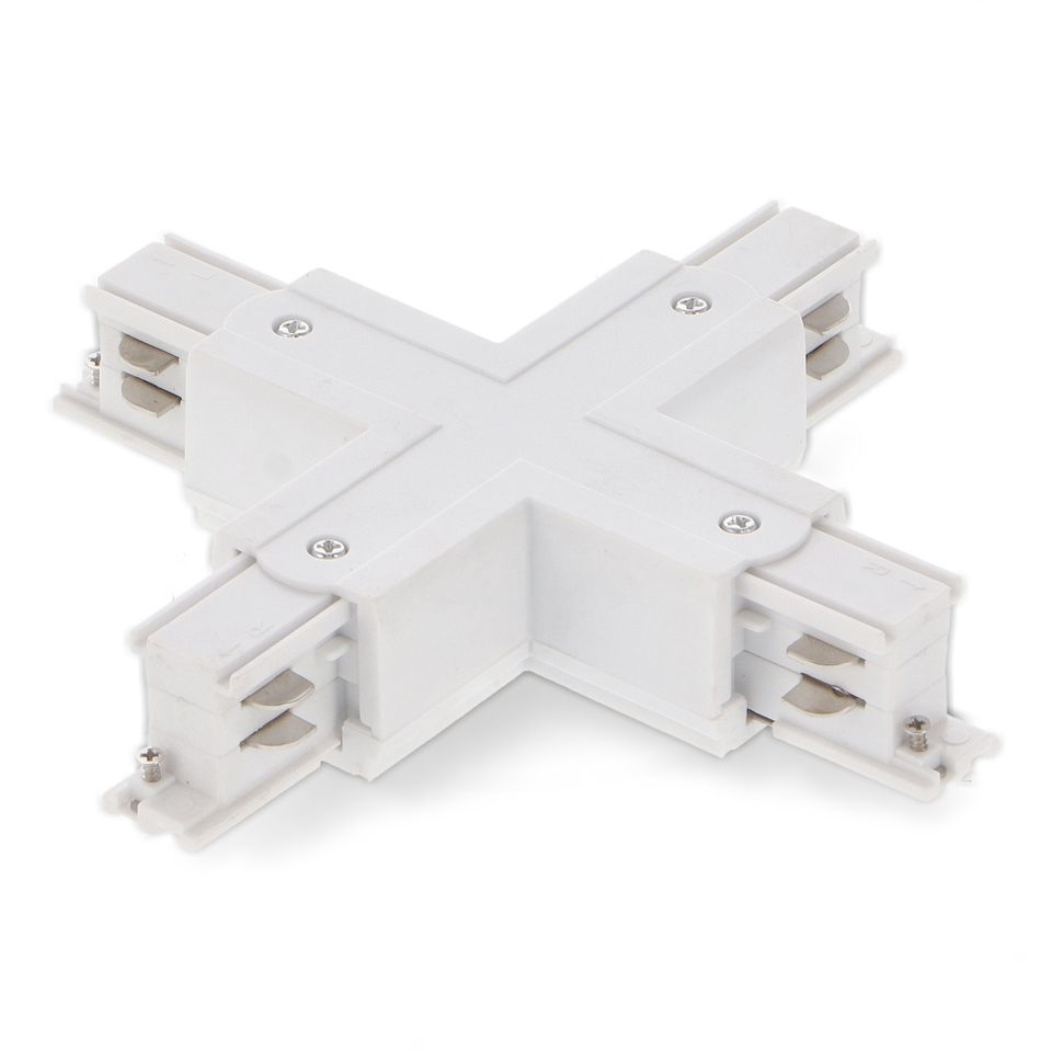 conector tipo x para carril trifsico, ideal para sistemas de iluminacin y distribucin elctrica en entornos comerciales.