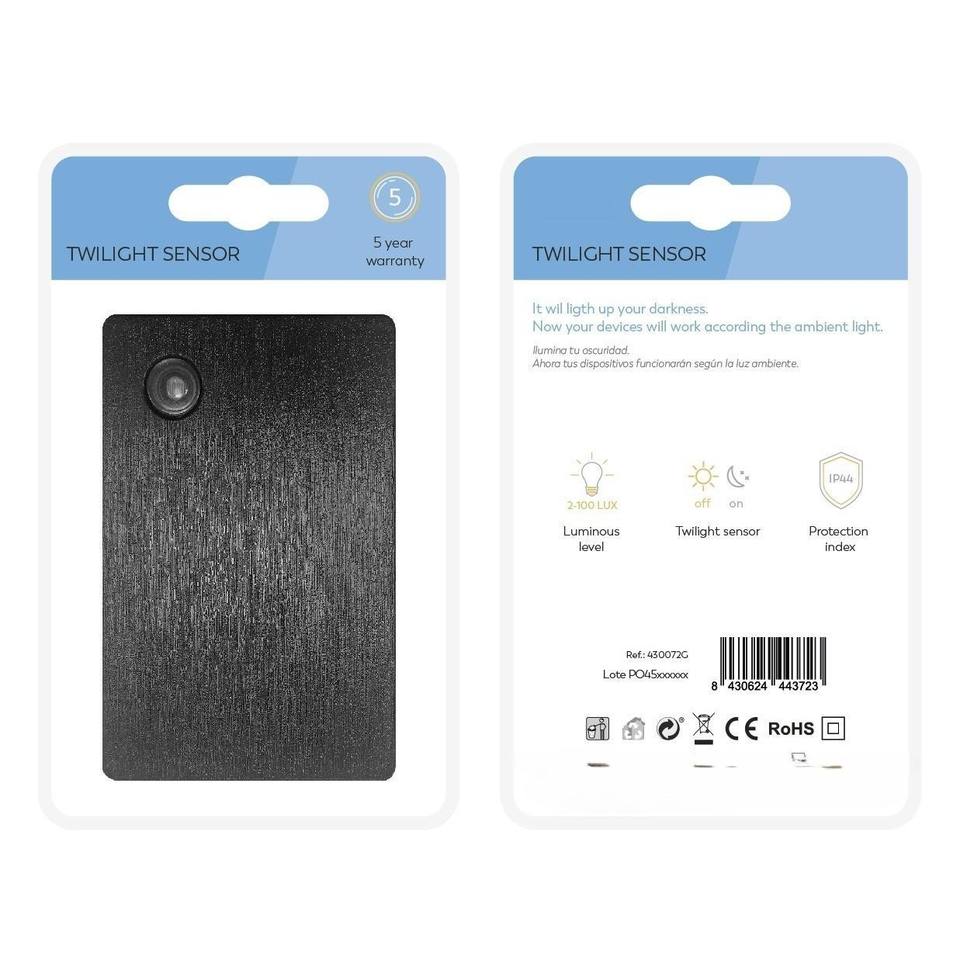 detector crepuscular exterior no programable, ip44, color negro, til para automacin de luces y seguridad en exteriores.