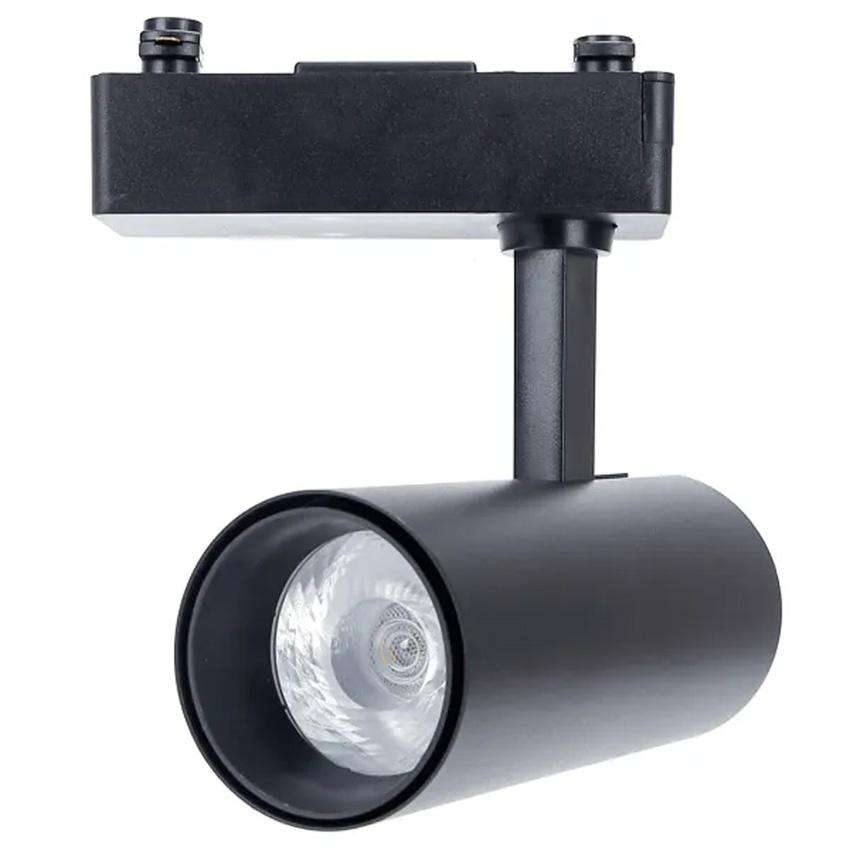 Faretto LED da binario nero 10W, tre fili, ideale per l'illuminazione di spazi commerciali ed esposizioni.