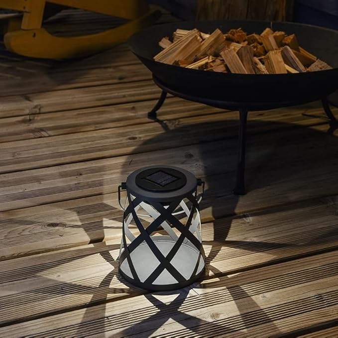lmpara solar decorativa metlica negra, resistencia a la intemperie, luz led, ideal para exterior y decoracin de jardines.