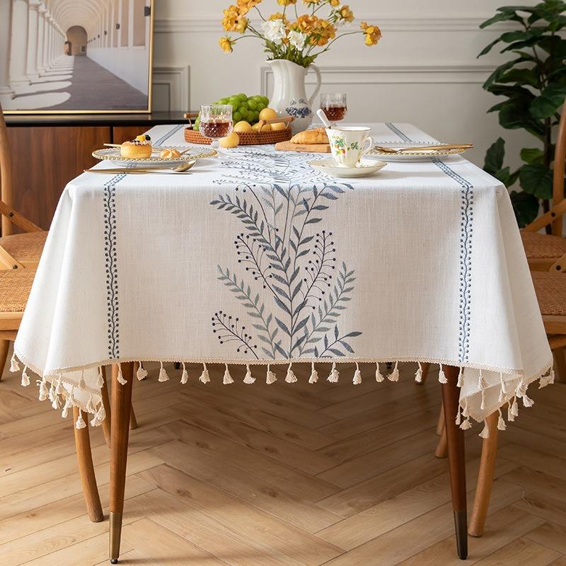 Tovaglia rettangolare in cotone e lino con ricami eleganti e macramè, dal design moderno e semplice, per decorazioni domestiche e feste.