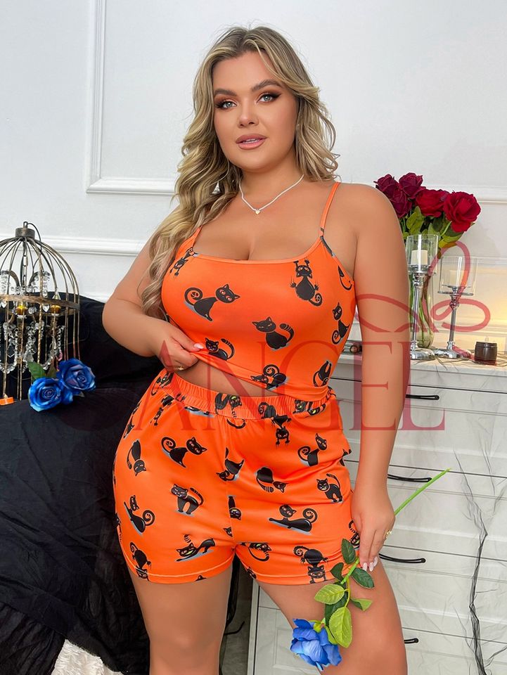 plus size mature women sexy pajamas KISS ME ANGEL 1XL 2XL 3XL 4XL orange cat printing sexy pajamas for women set