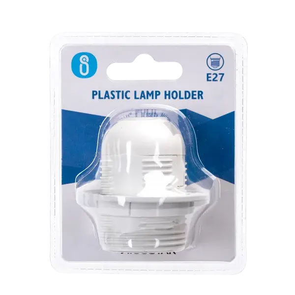 Portalampada E27 in plastica bianca con terminale a molla e filettatura completa, ideale per luci domestiche e applicazioni